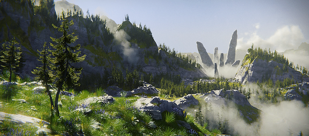 Artwork used as reference for the video sample landscape: https://www.artstation.com/artwork/8BaAbq